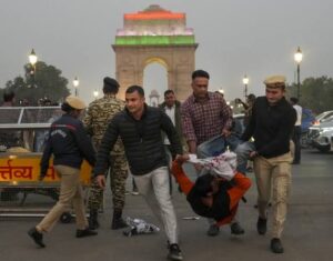 However, the demonstration soon turned chaotic. According to police accounts, some protesters broke through barricades, occupied the road, and reportedly sprayed chilli POWDER in the faces of officers trying to disperse them. Several police personnel suffered injuries, particularly to their eyes and face, and were sent to Ram Manohar Lohia (RML) Hospital for treatment.