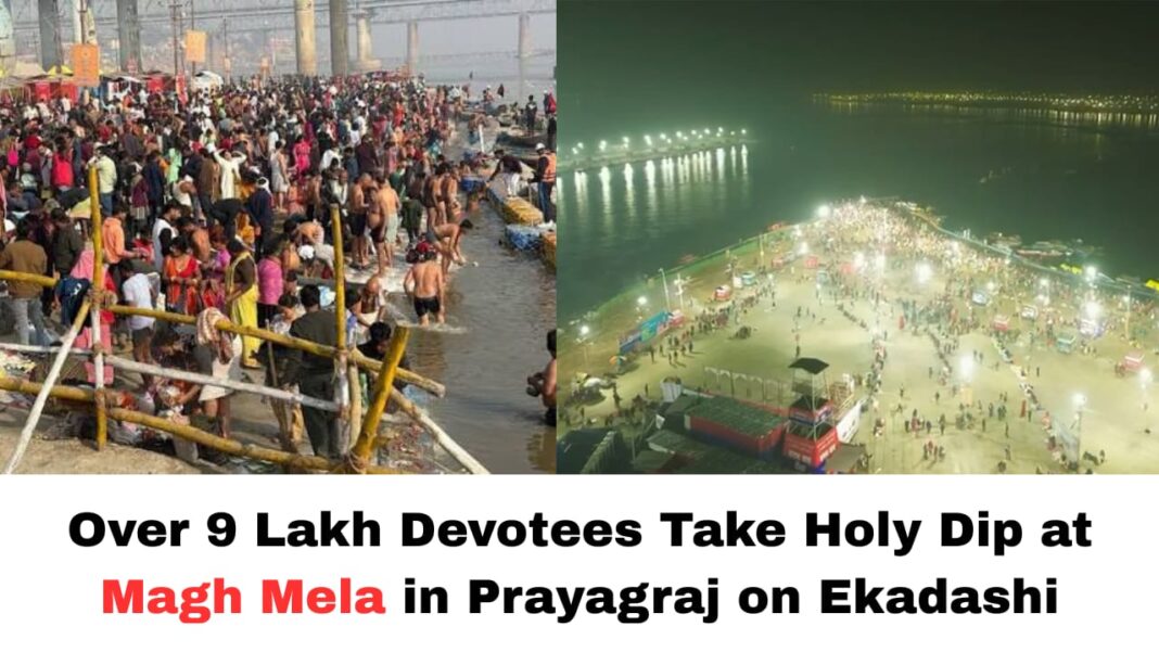 Prayagraj, Uttar Pradesh — Tens of lakhs of devotees thronged the Sangam Ghats in Prayagraj on Ekadashi (January 14, 2026) to participate in the sacred ritual of holy bathing during the ongoing Magh Mela. According to officials, by early morning around 6 a.m., over 9 lakh devotees had already taken a dip in the Triveni Sangam, the confluence of the Ganga, Yamuna, and mythical Saraswati rivers — braving freezing temperatures and dense crowds to seek spiritual merit.