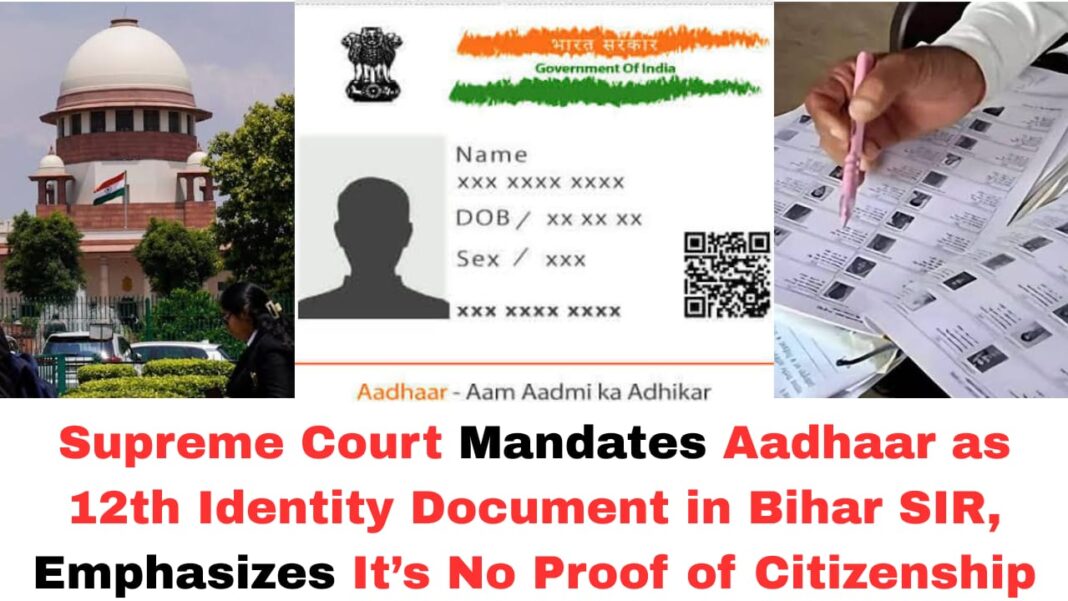The Supreme Court of India has delivered a significant ruling in relation to the ongoing Special Intensive Revision (SIR) of electoral rolls in poll-bound Bihar. The apex court has ruled that Aadhaar must be accepted as the 12th valid identity document, while unequivocally clarifying that it does not constitute proof of citizenship.